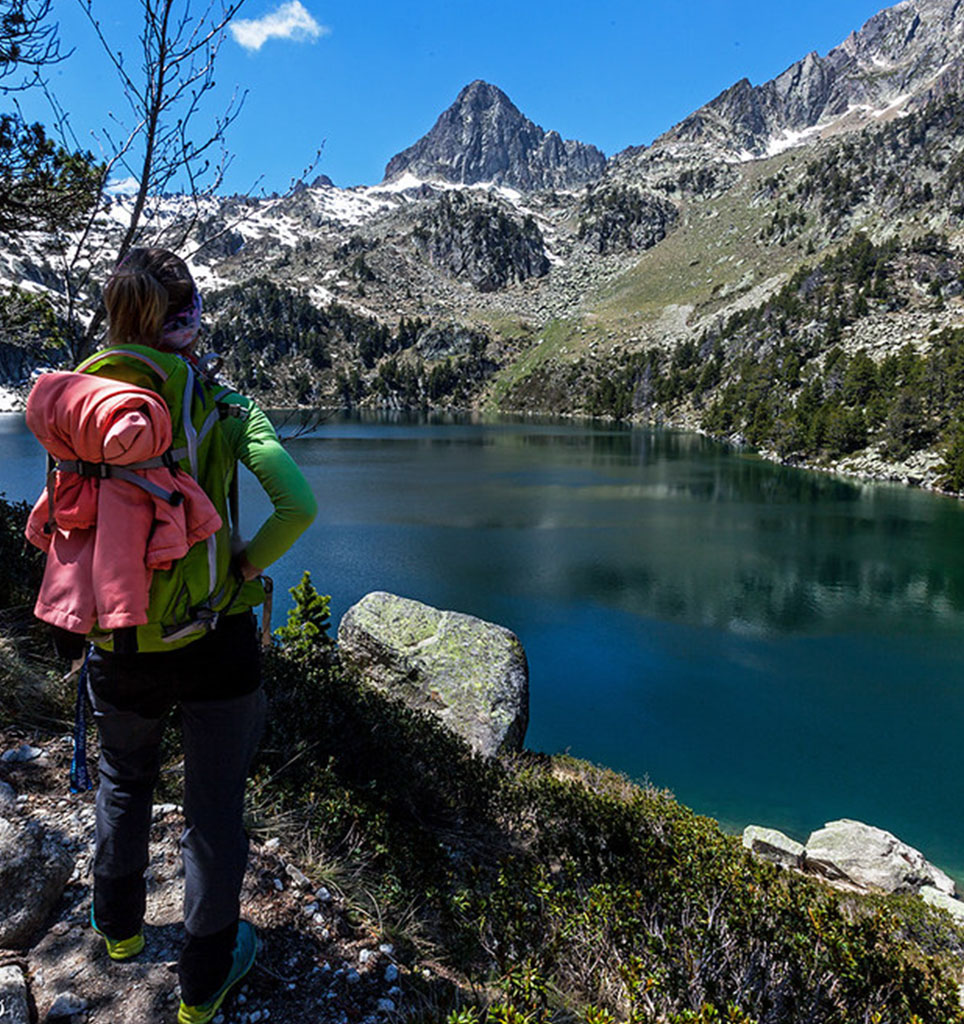 Una caminante se detiene frente a un lago cristalino, rodeado de montañas nevadas. La quietud del agua, la fuerza del paisaje y la inmensidad del cielo transmiten una paz difícil de describir.