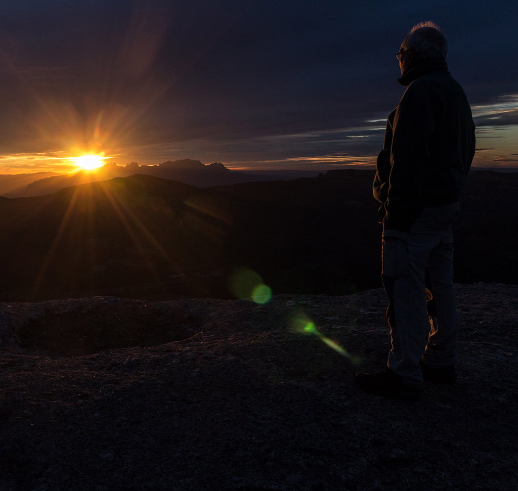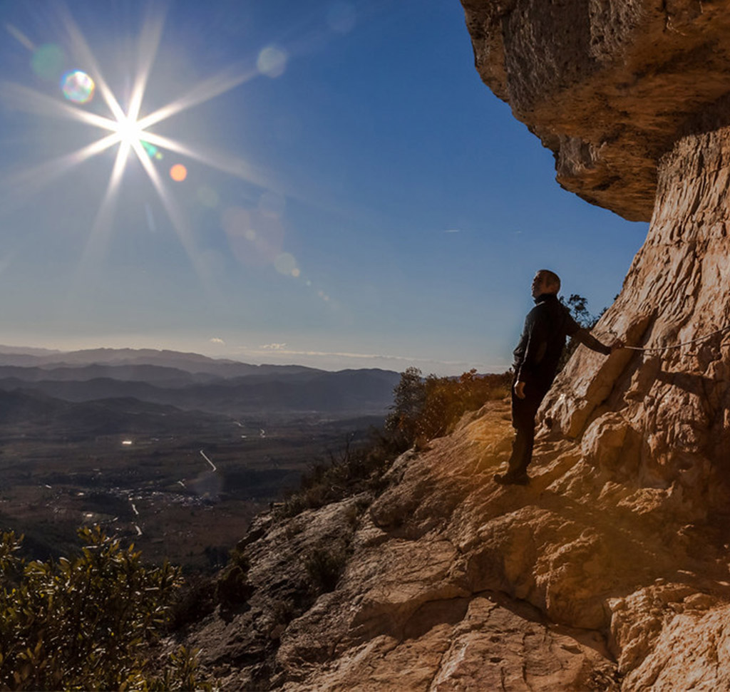 Dos caminantes contemplan el horizonte. Uno desde lo alto de una cima, el otro al borde de un acantilado bañado por la última luz del día. Momentos de reflexión, de conexión con el entorno y con uno mismo. El sol se pone, pero la aventura apenas comienza.
